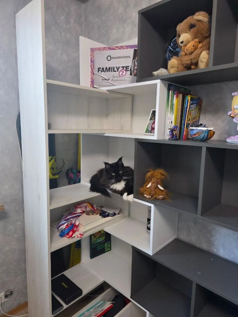 Заказали мебель на сайте, в наличии не оказалось, пришлось немного ждать, получили в декабре, успели собрать перед Новым годом, ребёнок в восторге ) Коту очень понравился стеллаж