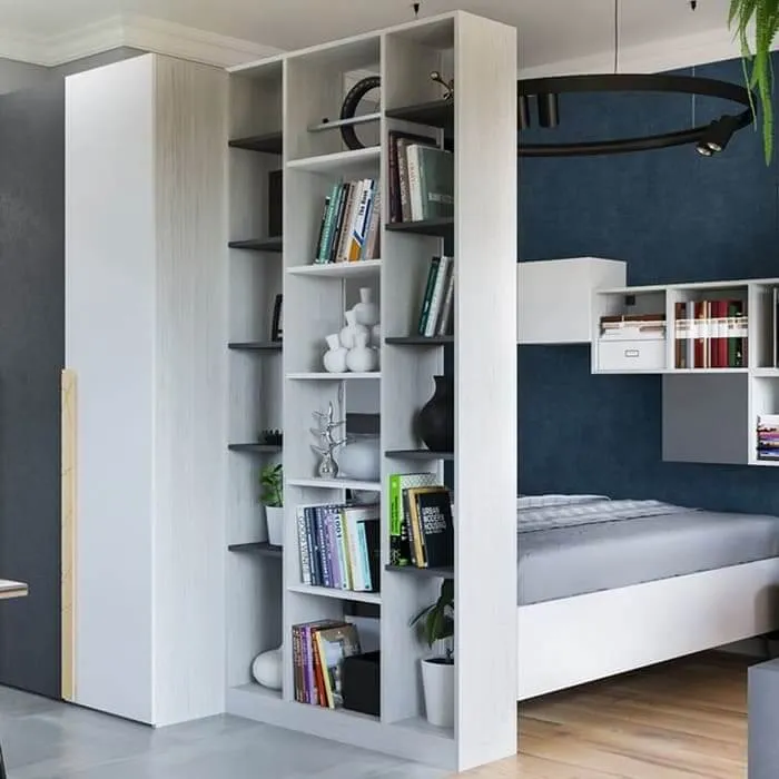 стеллажи трансформеры. Устанавливаются практически в любой точке комнаты и подходит для размещения в ниши. Стеллаж с легкостью может служить перегородкой. С его помощью делать перестановку одно удовольствие.