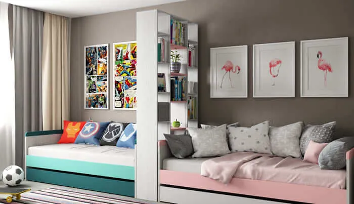 Если возможности расселения нет, постарайтесь разделить общую комнату, выделив каждому личное пространство. Разделить комнату можно с помощью стеллажей, гипсокартонных перегородок или ширм. В первую очередь необходимо разделить кровати, в то время как учебная и игровая зоны могут оставаться общими.