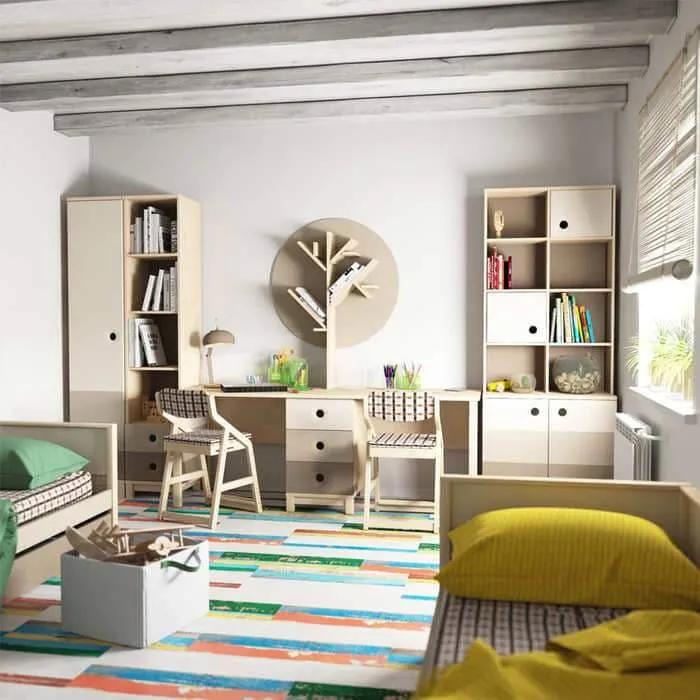 Если дети живут в одной комнате, для хранения вещей можно установить общий вместительный шкаф или гардеробную. Не забываете выделить персональное место для хранения вещей каждому ребенку: тумбочка, полки, ящики в комоде. Учебная и игровая зоны могут быть общими, но зоны сна обязательно разделены.