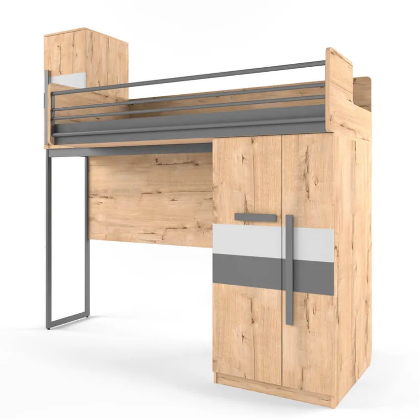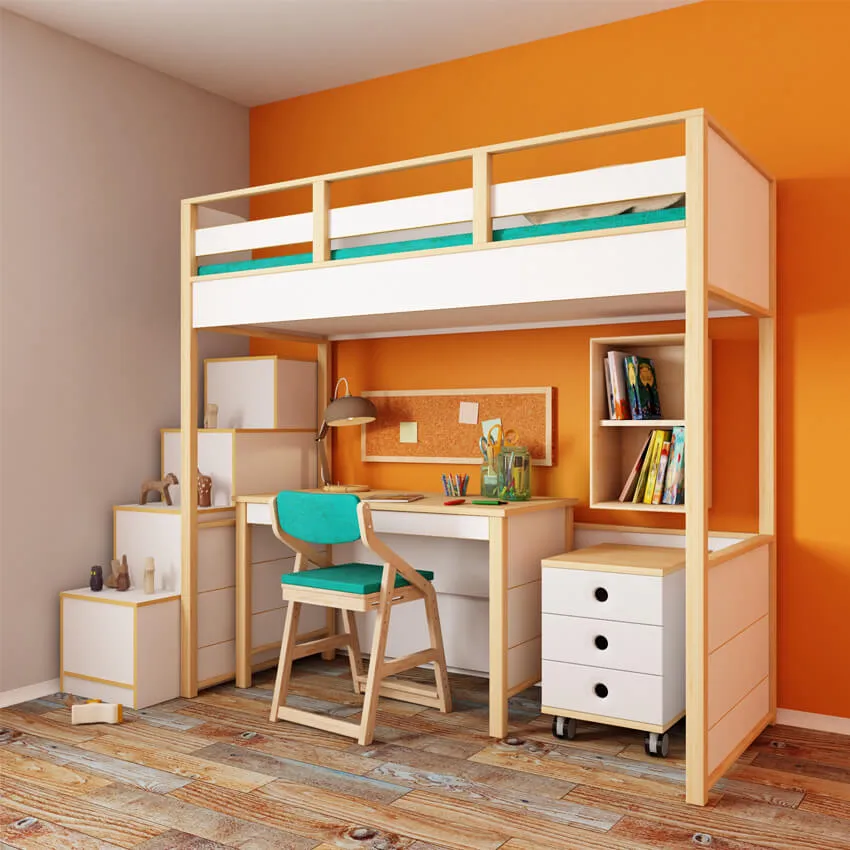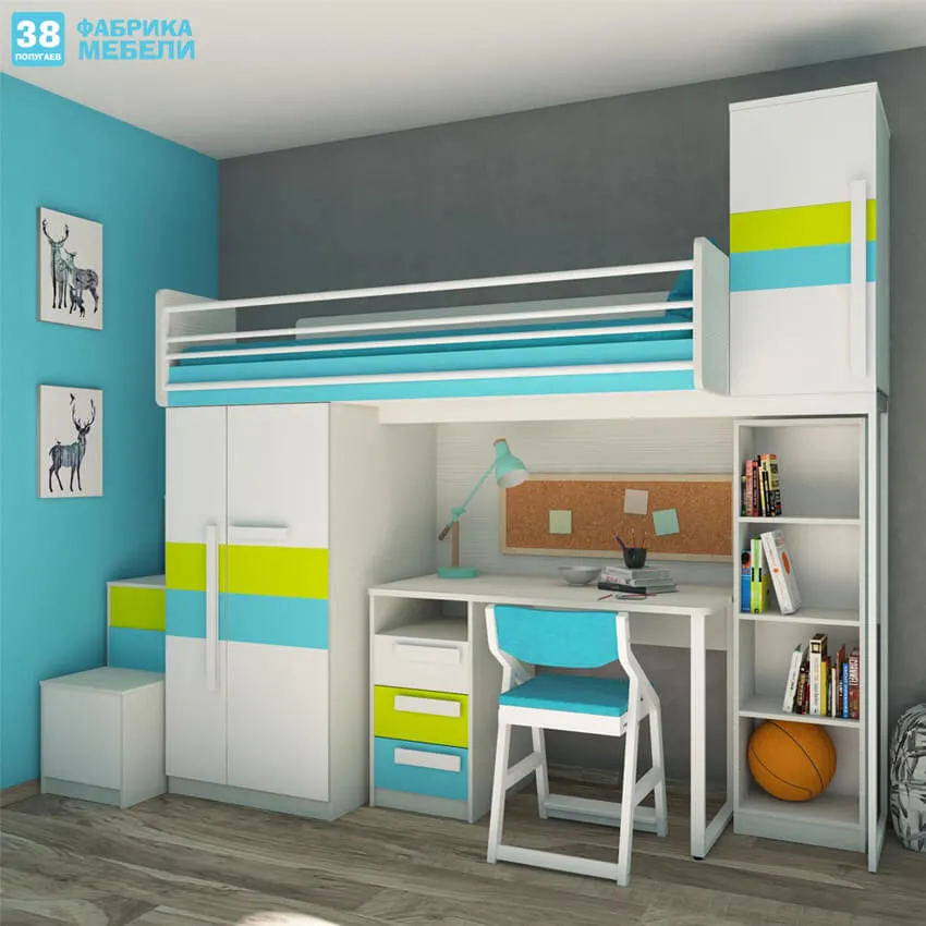 Для ребенка от 5 лет хорошим решением может стать кровать-чердак, внизу которой будут расположены личный стол и шкаф.