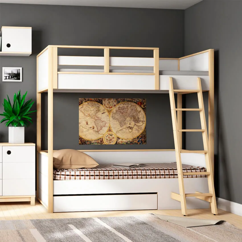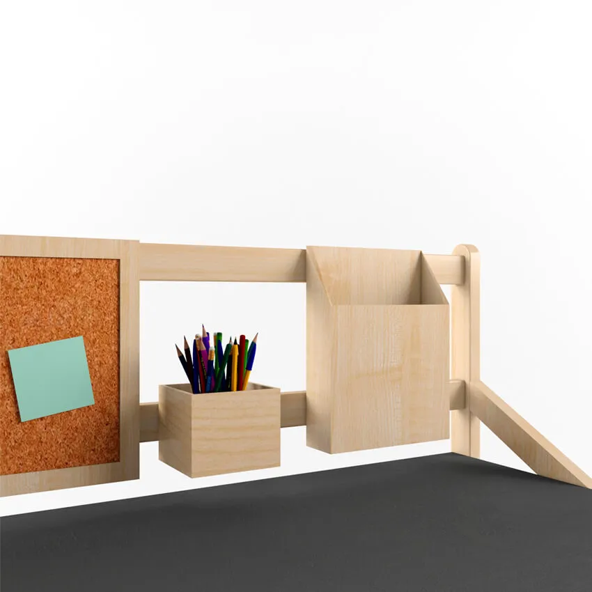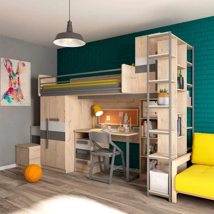 Сверху окажется спальная зона, а внизу будет стоять стол и стул. Отлично, если к кровати-чердаку приставлены ступени со скрытыми ящиками. Такой тип лестниц наиболее безопасен и, к тому же, дает дополнительные места хранения для игрушек. К стене над столом можно повесить органайзер с карандашницей и полки, и вот уже полноценное учебное место готово!