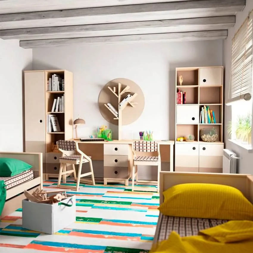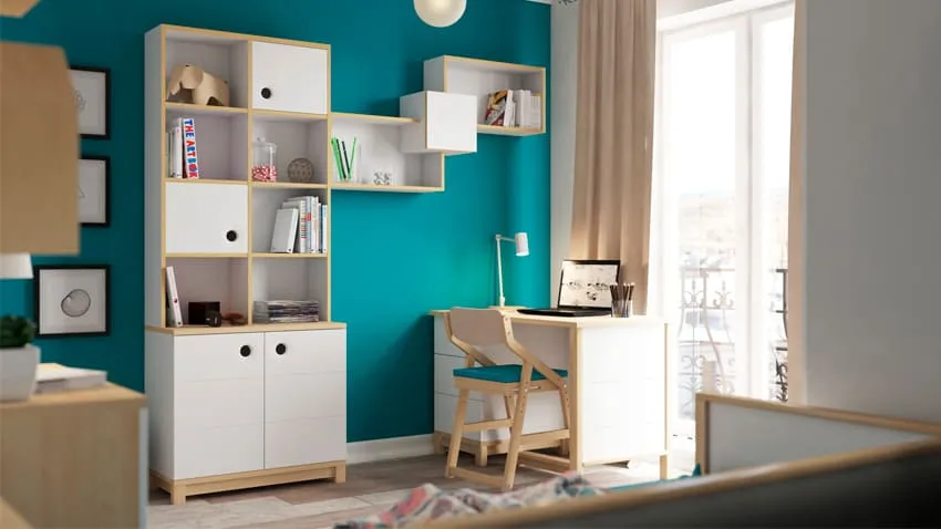 Дополнить стол можно тумбой с выдвижными ящиками, легкими открытыми полками и стеллажами для книг. Для двоих детей есть вариант стола на два рабочих места, он значительно сэкономит пространство в комнате.