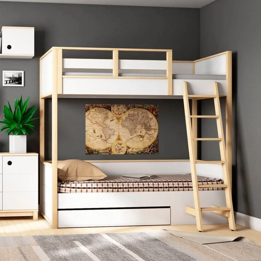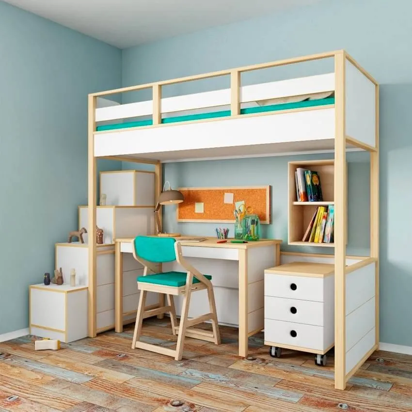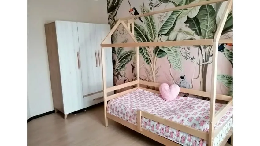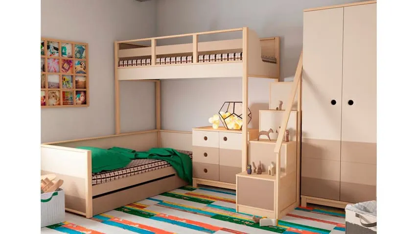 Детская начинается с кровати. Она должна быть безопасной, удобной, с хорошим ортопедическим матрасом. Если детей двое, а комната не слишком большая, то остановите выбор на двухъярусной конструкции.