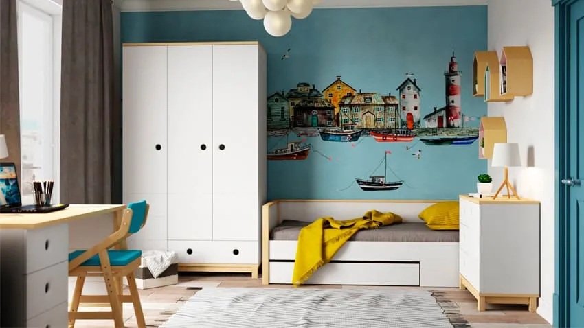 Наполняйте детскую аксессуарами по минимуму, потому что наверняка ребенок захочет сам расставить на видных местах свои игрушки, книжки, поделки, рисунки.