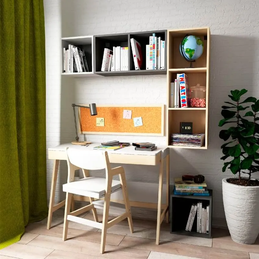 Для учебного места обязательно хорошее естественное и искусственное освещение. Разместите письменный стол у окна и дополните его настольной лампой.