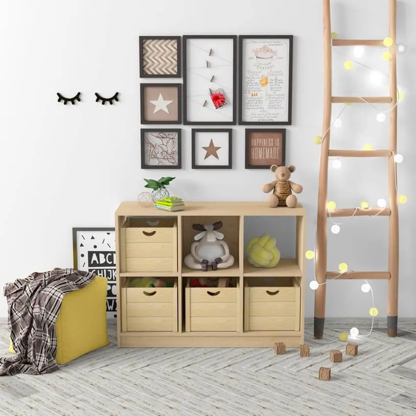 Дополнительно украсить комнату можно растениями, коробами и корзинами под игрушки, пуфами.