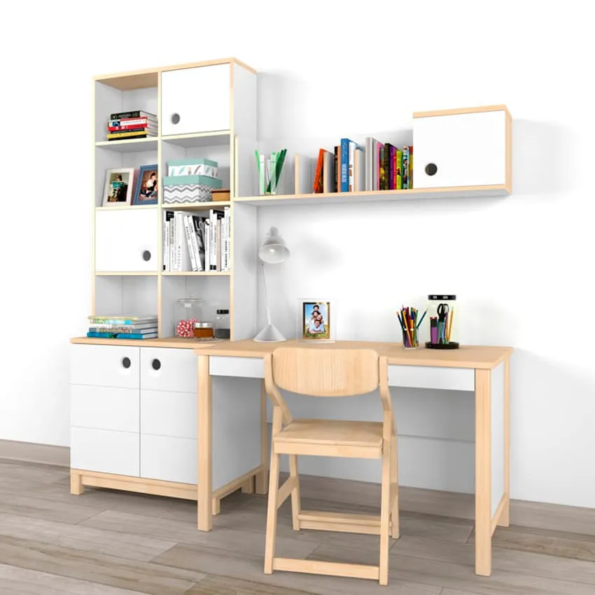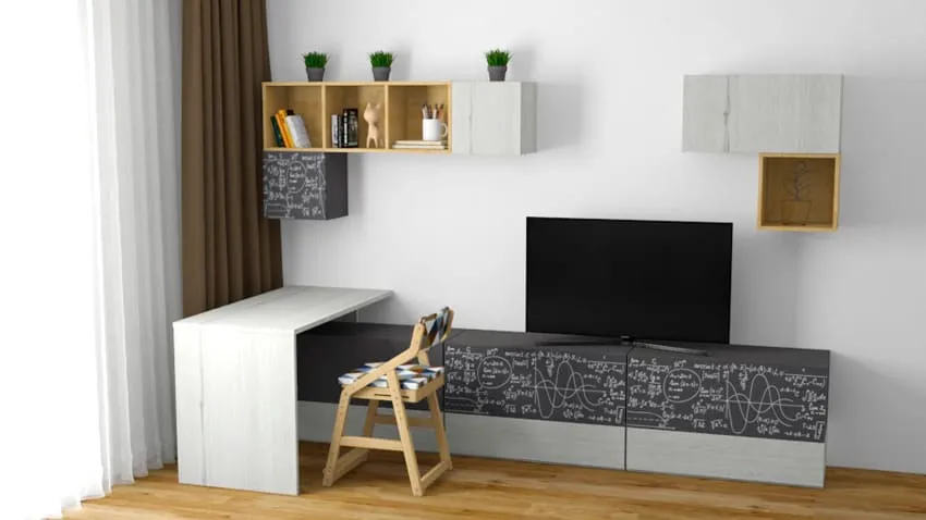 Здесь необходимо создать лаконичную, строгую, деловую обстановку. Так ребенок сможет сосредоточиться на занятиях и его ничего не будет отвлекать. Желательно рабочее место отгородить от остальных зон, например с помощью воздушного стеллажа-перегородки.