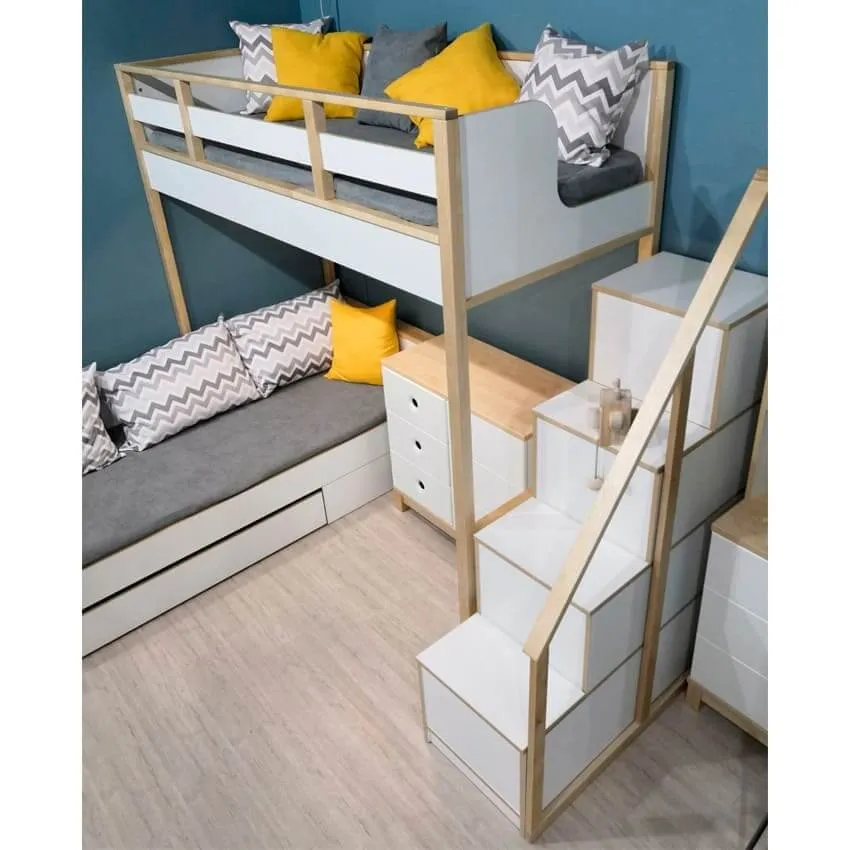 Детская мебель в скандинавском стиле обычно белая или деревянная. Стильное решение - сочетать эти два варианта. Такой дизайн идеально будет смотреться в комнате с любой отделкой.