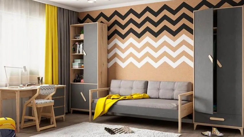 Подросткам понравится контрастный черно-белый дизайн комнаты. Он выглядит стильно, графично и напоминает нарисованный мультфильм.