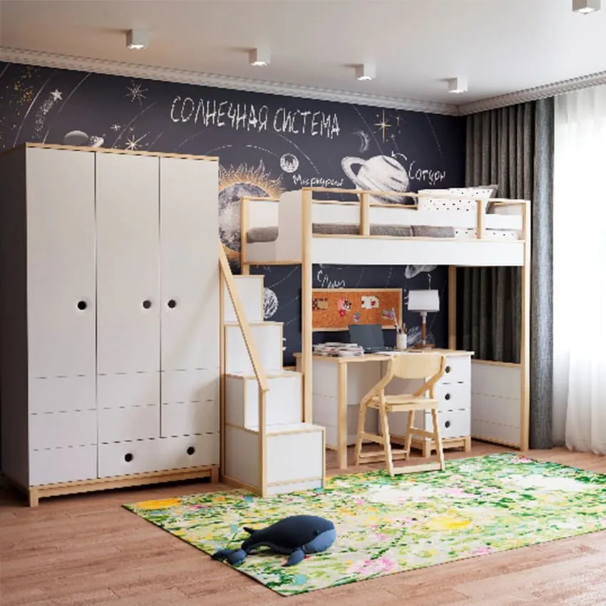 Он характеризуется приглушенными и темными цветами, такими как серый, коричневый, черный и металлические оттенки. Белый цвет добавляет свежести, света и графичности в такую комнату, а яркие акценты хорошо сочетаются с лофт-стилем, особенно для младших детей. Преимущество лофт-стиля заключается в его актуальности для подросткового возраста. Однако, при выборе лофт-стиля следует учитывать некоторые особенности. Он лучше всего подходит для комнат с большими окнами и высокими потолками, так как обилие темных оттенков требует хорошего освещения и пространства.