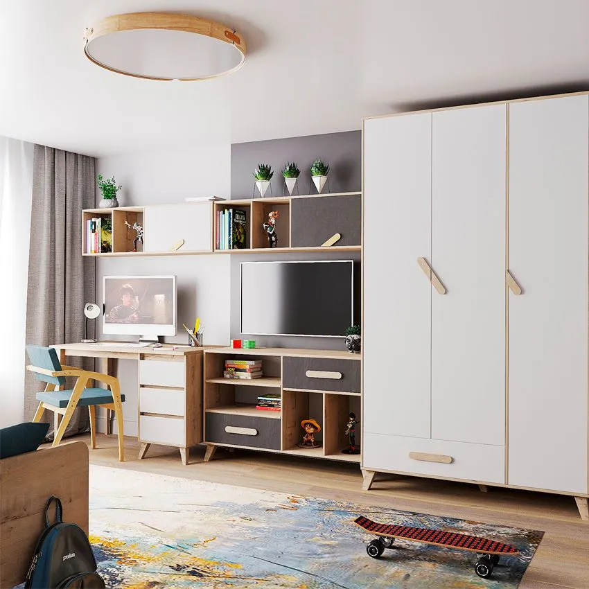 Интересное и практичное решение, когда стол, стеллаж и шкаф в единой композиции. Этот вариант отлично подойдет для школьников. В открытые ниши можно разместить книги и учебники, а в закрытые – одежду и обувь