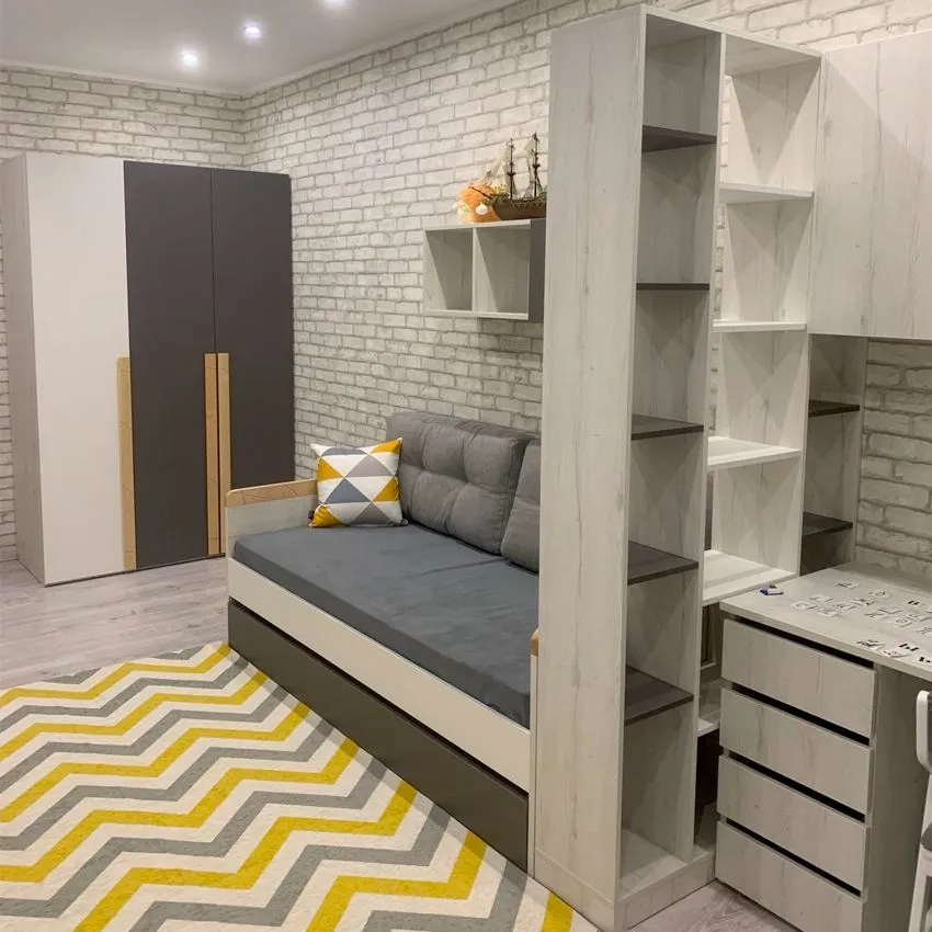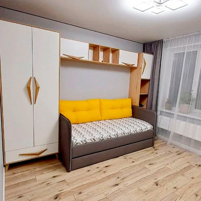 Плюс в том, что родителям не придется ломать голову, куда ставить каждый мебельный модуль по отдельности. Такой детский уголок с кроватью и шкафом станет настоящим личным пространством для вашего ребенка всего на 2 кв.м
