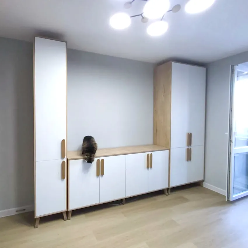 Поэтому лучше отдать предпочтение модульным вариантам и выстроить композицию нужного размера от стены до стены и от пола до потолка с помощью отдельных модулей: шкафов, пеналов, антресолей.