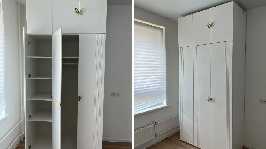 Особенность этого элемента мебели – отсутствие одной или двух боковых стенок. Двери шкафа монтируются к стене комнаты или перегородке. Выглядит стильно и современно, но стоит учесть, что такую конструкцию вы уже не сможете перенести или переставить.