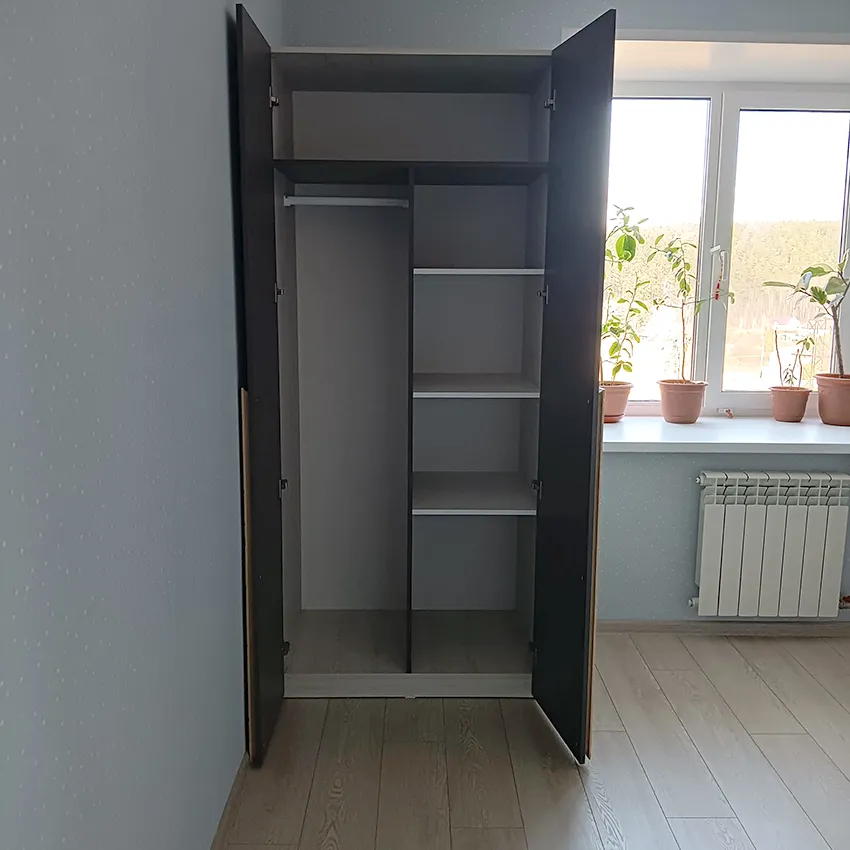 Классическая компактная модель. Две створки обеспечивают удобный доступ к вещам. Одежда в таких шкафах может храниться на полках и висеть на плечиках. В некоторых моделях есть ящики для нижнего белья