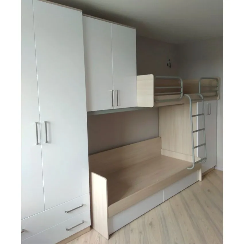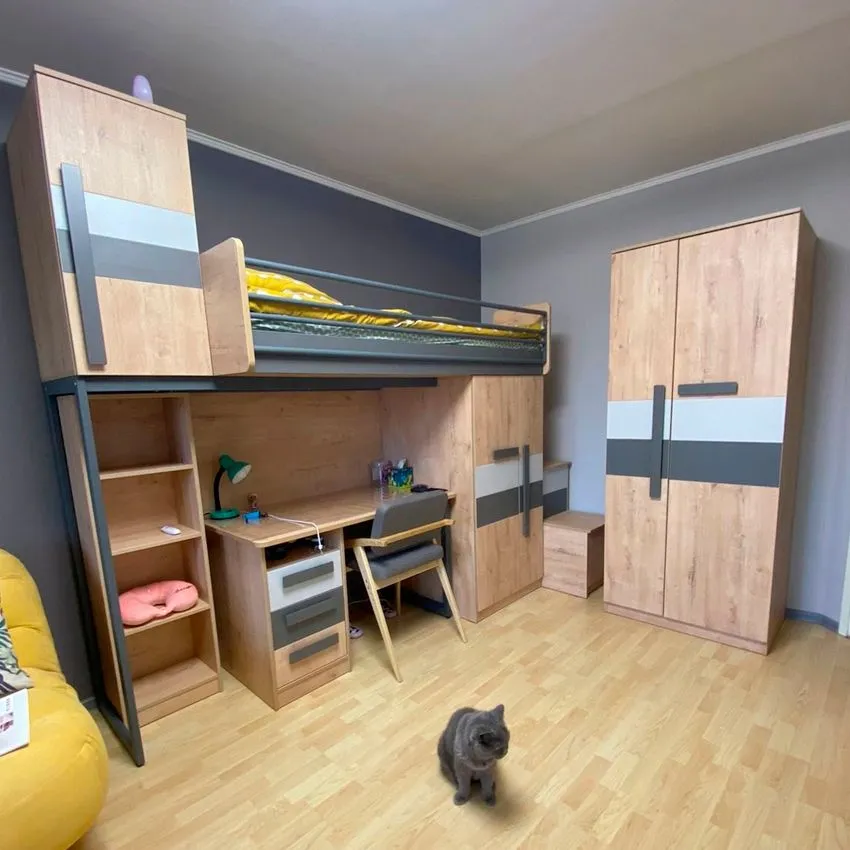 Компактный вариант: шкафчик располагается на нижнем ярусе под кроватью. Рядом можно поставить письменный стол, где ваш ребенок будет делать уроки