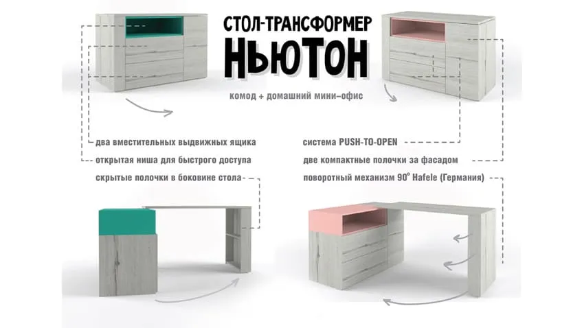 - Модели подойдут даже для самой маленькой комнаты: в их основе лежит принцип: «Лёгким движением руки» комод (тумба, стеллаж) превращается в стол.