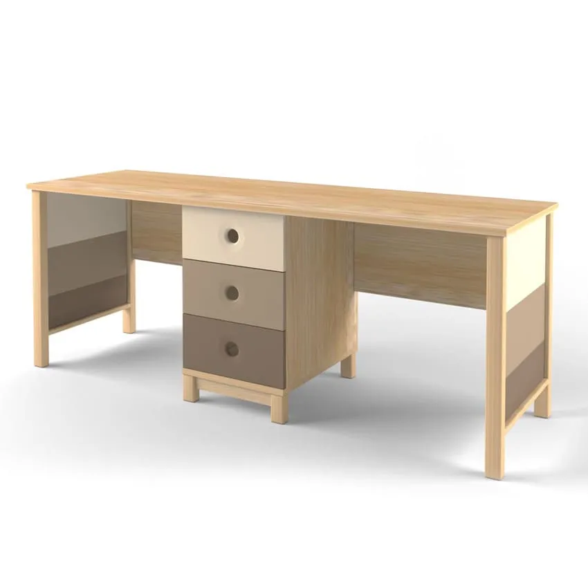 - Стандартный стол для двоих детей имеет единую длинную столешницу, которая разделена одной или двумя тумбами.