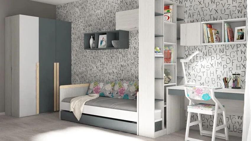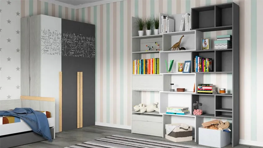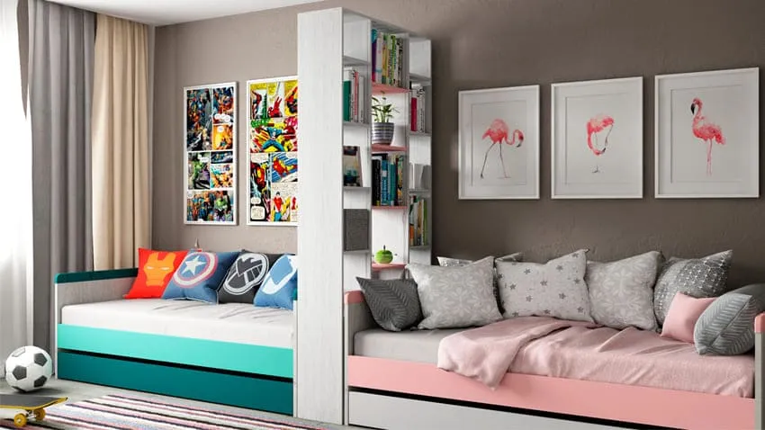 Но что делать, если разница в возрасте детей значительна или вместе живут мальчик и девочка? Лучше всего разграничить пространство комнаты стеллажом или шкафом. Так у каждого ребенка появится приватное пространство