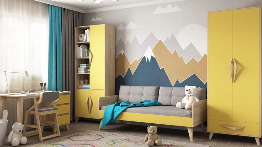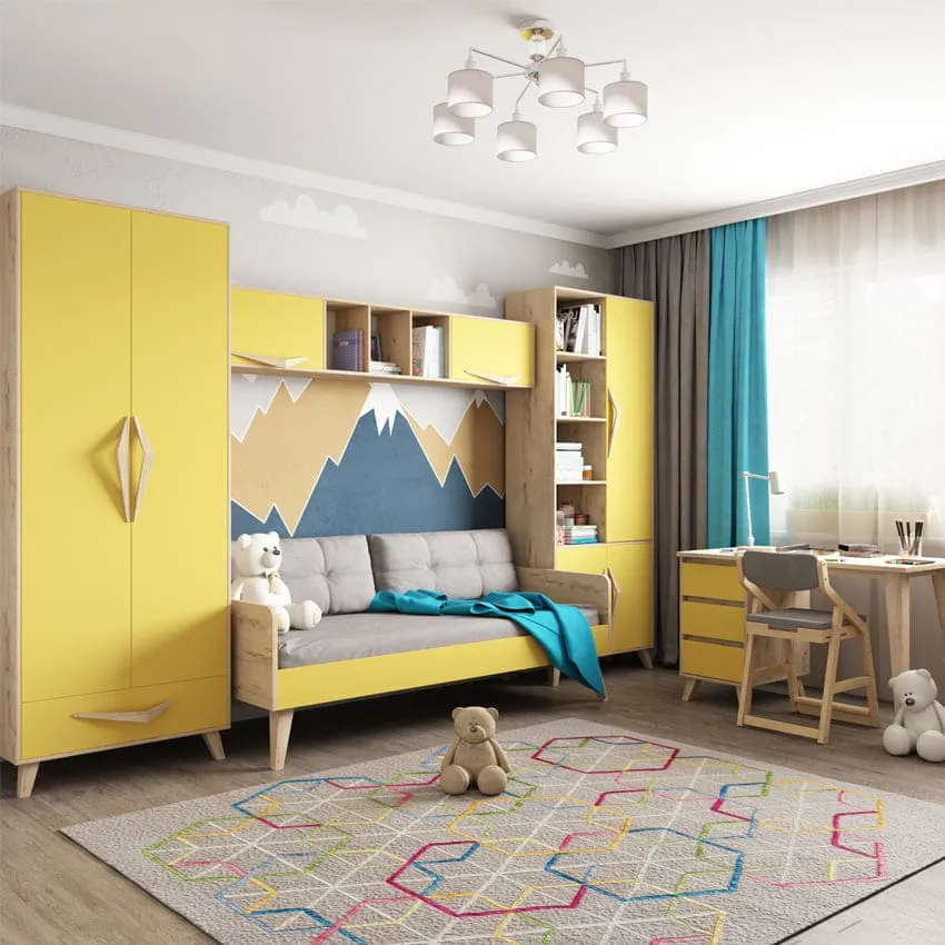 Теплые краски - отличный выбор для оформления детской комнаты. Все оттенки желтого стимулируют умственную деятельность, положительно влияют на зрение, улучшают настроение. Но если ваш ребенок импульсивен, подвержен частым сменам настроения, то выбирайте более спокойные, разбеленные тона. Детская мебель в солнечных оттенках добавит в интерьер игривости и еще большей жизнерадостности.