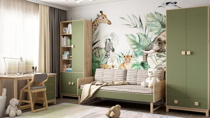 Зеленые тона — это настоящая цветотерапия для ребенка. Зеленый стабилизирует давление, помогает сосредоточиться, нормализует дыхание, способствует крепкому и здоровому сну. Отличный вариант для тех, кто оформляет дом в эко-стиле.