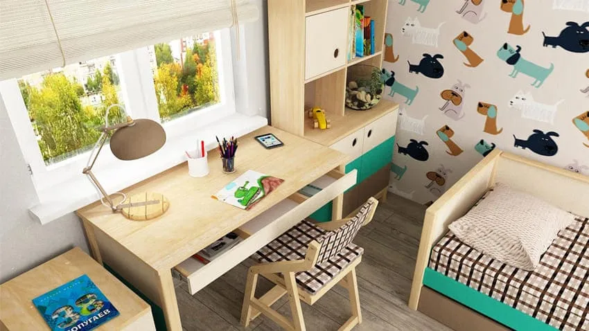 Что касается учебной зоны, тут есть два варианта, в зависимости от площади комнаты: