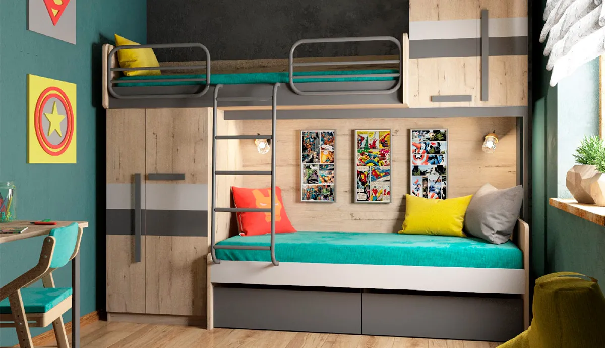 Подростковая кровать-чердак сочетает в себе спальное место наверху и свободное пространство внизу. Подкроватную зону можно оставить как место для отдыха, разместив там кресло-грушу или же оформить как учебный уголок. Некоторые чердаки дополняются шкафом под одежду.
