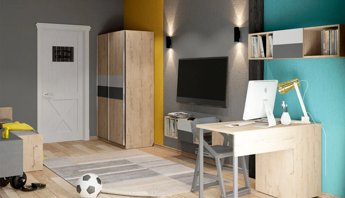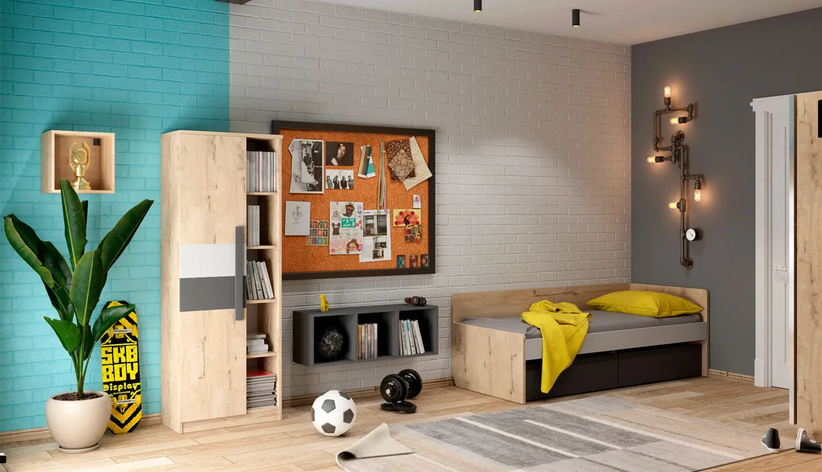 Визитная карточка направления — фактуры из кирпича и бетона, предметы из металла и дерева. Немного бунтарства в подростковой комнате не повредит: настоящие дорожные знаки, винтажные таблички, плакаты с супергероями, лампы Эдисона. Мебель спокойных, древесных оттенков уравновесит интерьер и станет фоном для индустриального декора.